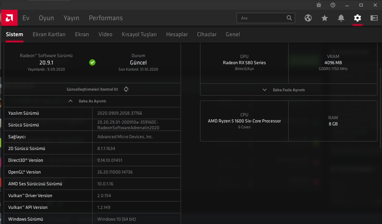 radeon software'i açın ayarlara girin sistem bölümünde gözükecektir gözükmüyorsa güncelleştirmeleri denetleye bas sonra indir son sürüm 20.10.1 olması lazımradeon software surumu mu ?