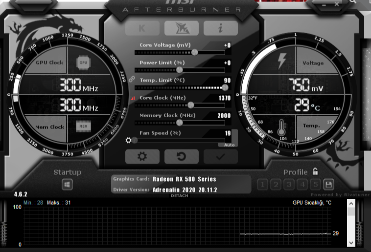 Bu ayarların sıfırlanmış hâli mi? Eğer öyleyse Core Clock ayarını 1310 yapın, Core Voltage ayarını -100 yapın, ayarları kaydedip ilk yaptığınız ayarlar ile Heaven Benchmark testi yapın.