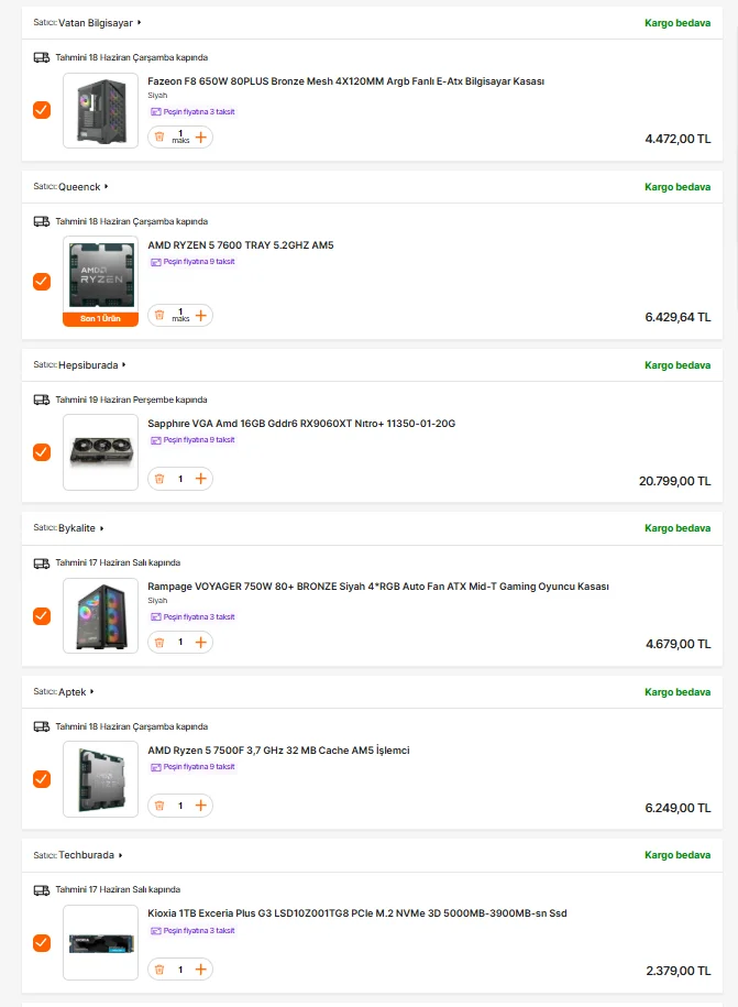 merhabalar 45k ya yakın bütçemvar 9 ay taksit avantajından dolayı hepsiburada'yı tercih ediyorum ram hariç işlemci tarafında 7600 veya 7500f tercih edeceğim birde kule tipi soğutucu alıcam 1000-1500 bandında