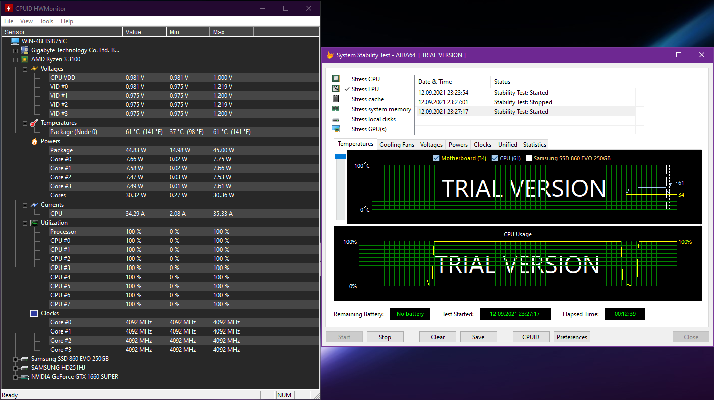 Buradada sadece FPU seçeneği işaretli bir şekilde yaptığım test sonucunu paylaşıyorum; (Bu beni çok şaşırttı çünkü 4.25GHz yapıp 1.1V'a çektiğim zaman 70'e kadar çıkan sıcaklık bir anda 61'i bile geçemiyor)