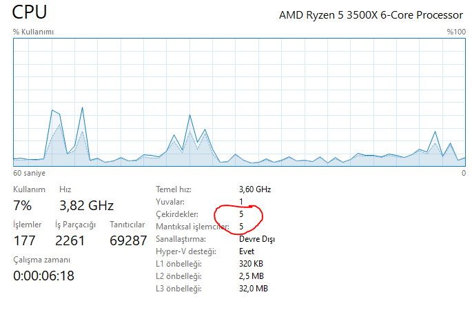 Amd ryzen master uygulamasını indirip kurun, sonra oradan bakın tüm çekirdekler aktif mi diye? Eğer aktifse userbenchmark ile test yapın, orada belli olur, eğer aktif değilse aktifleştirmeye çalışın sorun çıkarsa garantiye yollayabilirsiniz.Ryzen 5 3500x işemcim var 6 çekirdek ama görev yöneticisinde 5 çekirdek gösteriyor neden ?