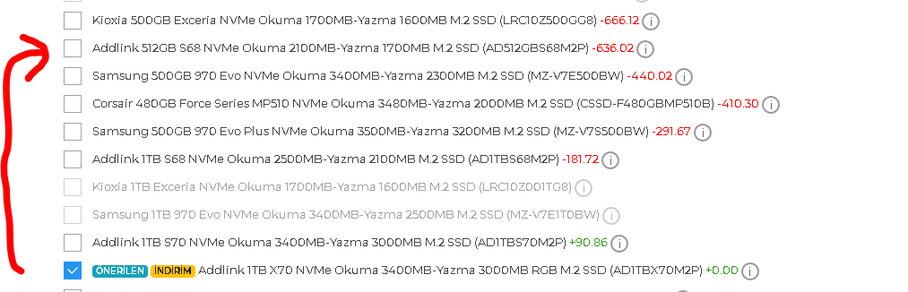 sinerji fiyat düşürmeniz için önerim m2 ssd yi böyle seçip resimde işaretlediğmi.