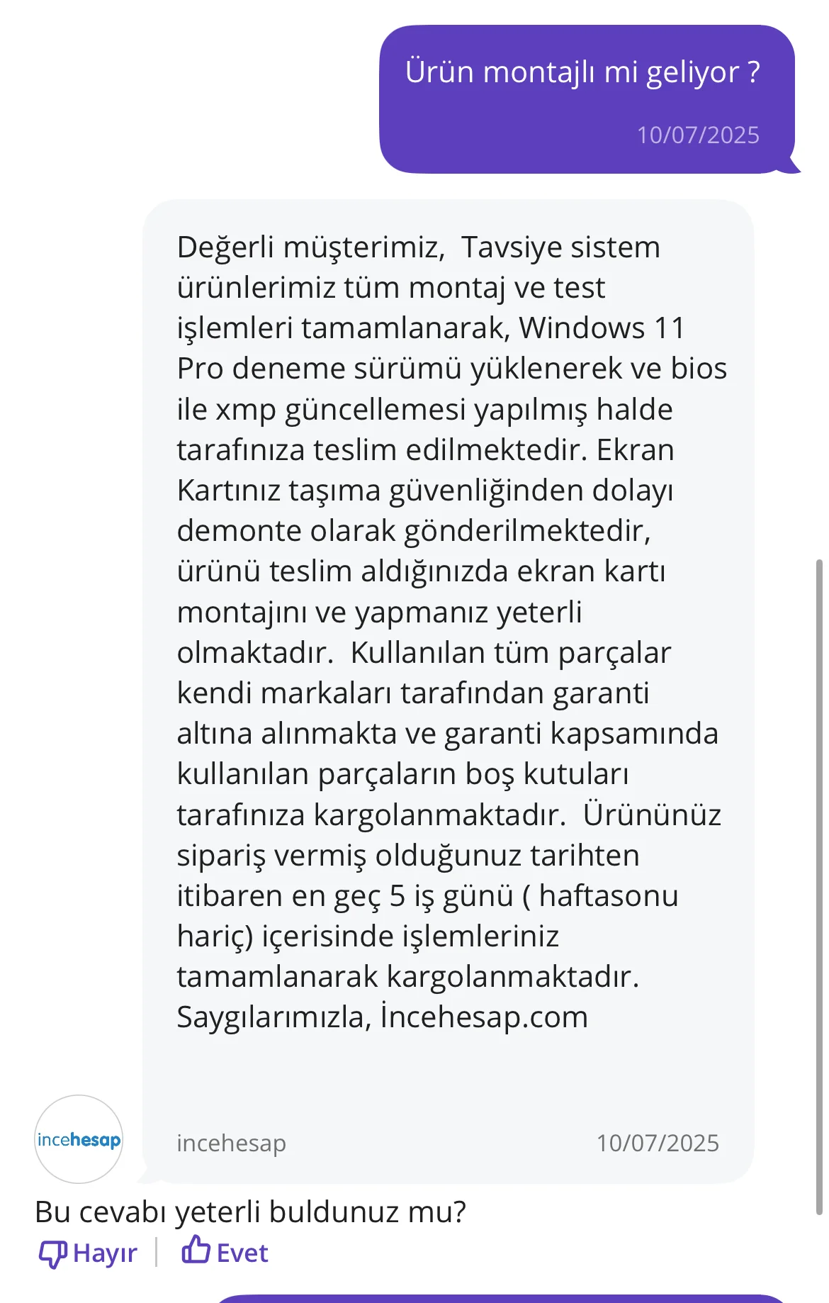 n11 İncehesap işbirliği ile alakalı konum bu link. Cevaplarınıza biraz göz attım. Peşin fiyatına 6 taksit ödeme kolaylığı gerçekten iyi. 550w bu sistem için düşük ama yetecektir. gönül isterdi ki en azından 600 - 650w olsun. Evet güç kaynağı çıkıp değişebilir bir parçadır. Anakartın a620 değil de b650 olması daha iyi olurdu. Ram gayet iyi bende aynı hynix modülü kullanan rami kullanıyorum piyasadaki en f/p ram diyebilirim. Ekran kartı zaten güzel. ssd 512 düşük en azından 1 tb idare ederdi. Şimdiki oyunlar büyük yer kaplıyor ve anakartta sadece 1 m2 ssd yuvası var bu nedenle yeni alsanızda eskisinin yerine takmanız gerekir eskisi de boşa çıkar(ikinci elden falan satılabilir). İşlemci soğutucu iyi değil tabi ama 7500f için yeterli olacaktır. O bütçeye daha iyi bir sistem parça parça tabii ki toplanabilirdi. Hazır sistem de toplanabilir di ama böyle ödeme kolaylığı maalesef şimdilik başka yerde yok. Genel yorumum bu şekilde hocam hayırlı olsun. Merak ettiğin bir durum olursa yaz lütfen. 👍 :peepokalp: