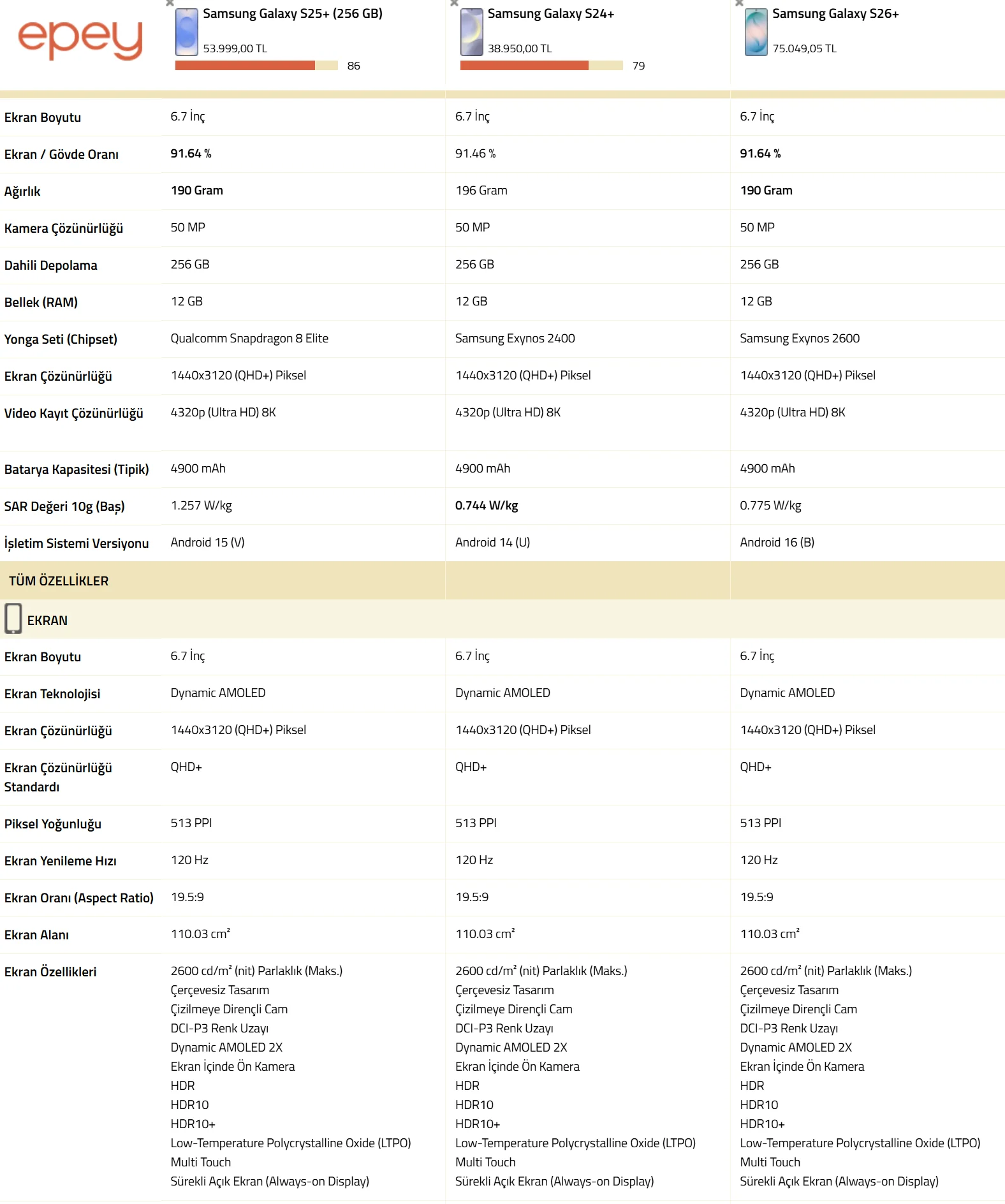 Epey - Samsung Galaxy S24+ - Samsung Galaxy S25+ (256 GB) - Samsung Galaxy S26+ özellik ve fiyat karşılaştırmasıwww.epey.com