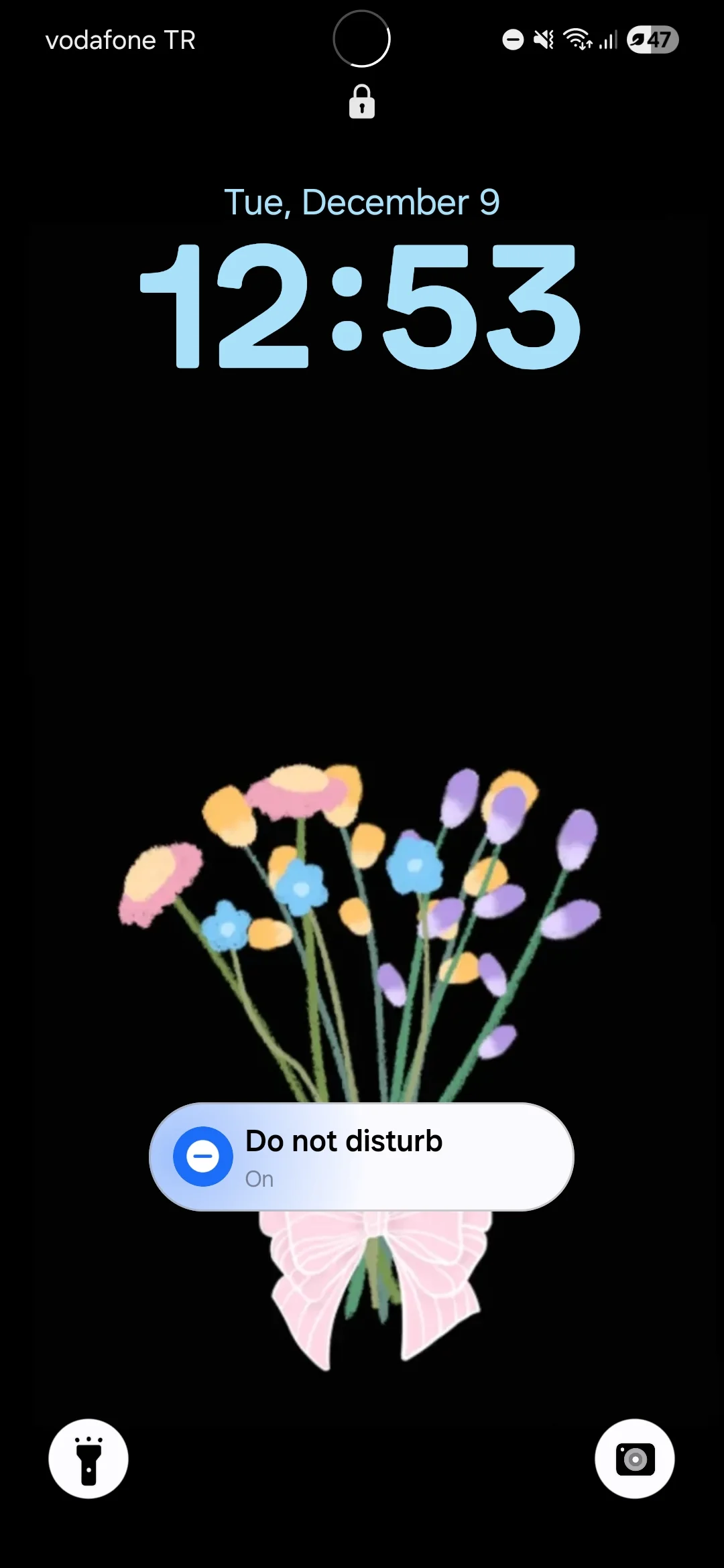 Karanlık aydınlık modu sebebiyle olabilir. Ayarlar-kilit ekranına git orayı kurcalarsan biraz kilit ekranı stili var onla da alakalı olabilir. O menüye kilit ekranındayken ekrana uzun süre basılı tutarak da ulaşabilirsin. Duvar kağıdının rengiyle de alakalı olabilir, Hani duvar kağıdı siyah ya belki telefon onu algılayıp, o butonlar gözüksün diye saydam yapmıştır.