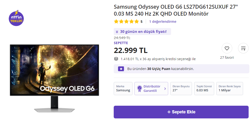 Samsung Odyssey G6 240Hz (Yeni çıkan OLED Monitör) 22999 TL