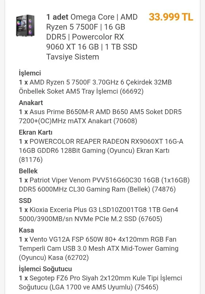 Omega Core | AMD Ryzen 5 7500F | 16 GB DDR5 | Powercolor RX 9060 XT 16 GB | 1 TB SSD Tavsiye Sistem - incehesap.com