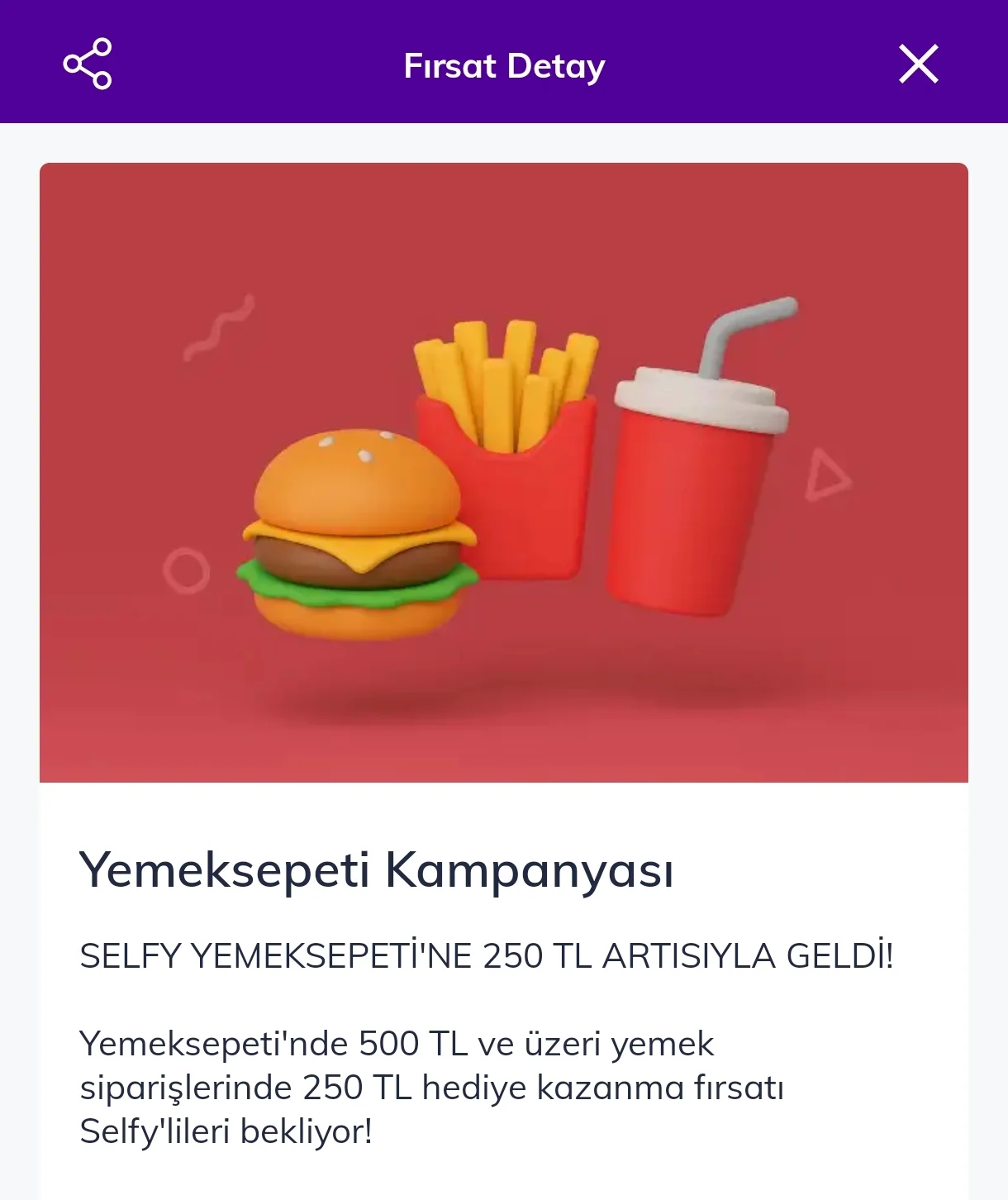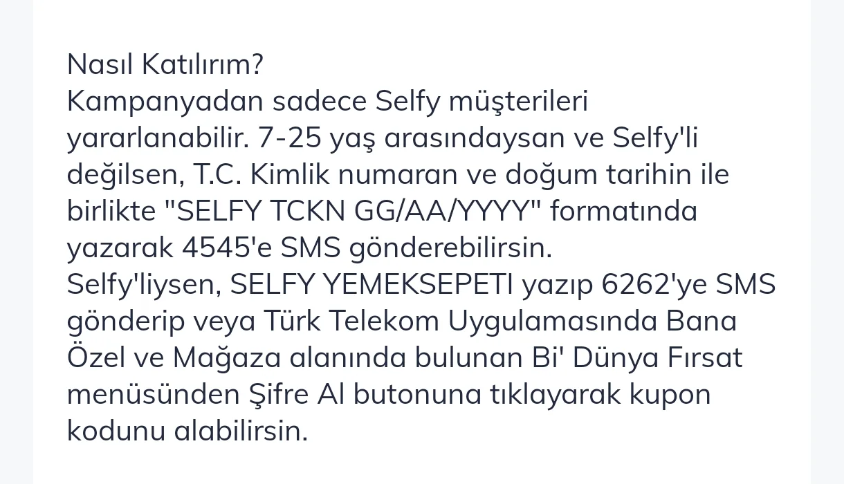 Sadece selfyliler yararlanabiliyor son gün 31 aralıkmış. ihtiyacı olan dışarıdan yemek yiyenler yararlanabilir. son eklediğim fotoğraftaki sayfadan ulaşabilirsiniz. link ekleyecektimde bulamadım mağaza sekmesinde en aşağı kaydırın bir dünya fırsat kısmında görünüyor.