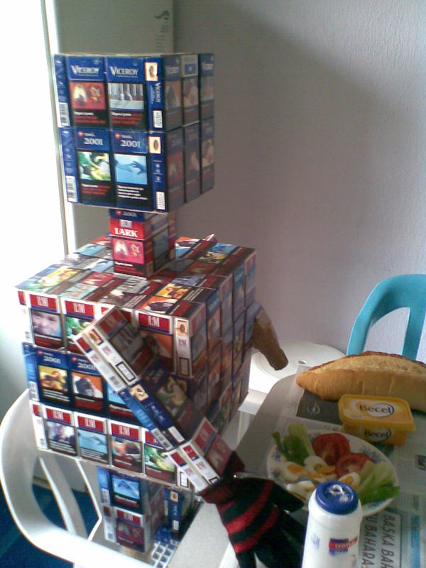 Paketlerin hepsini saklıyordum, internette biraz bakıyım dedim neler yapmış millet, herkes masa ev falan yapmış bende farklı bişey olsun istedim bunu yaptım, 1,5 saat kadar uğraştım, ama daha 15-20 tane falan paket arttı onlarıda kullanmak istiyorum, modifiye yapmak istiyorum ama nasıl bişey yapsam karar veremedim, fikri olan burada paylaşırsa sevinirim, bu arada bunlarda resimler;