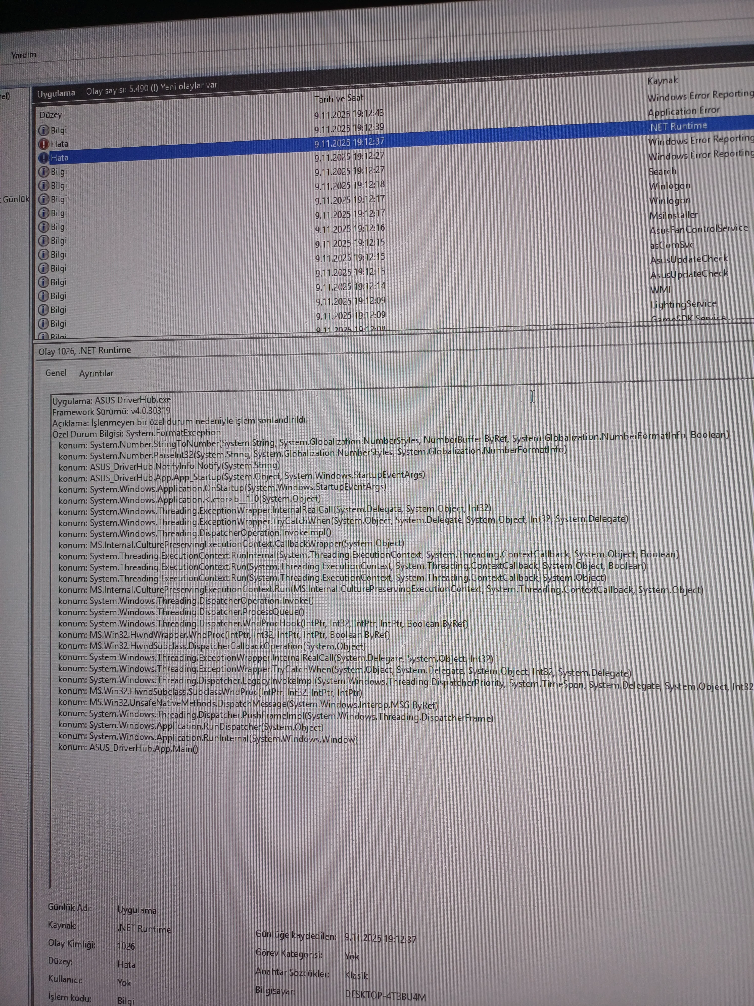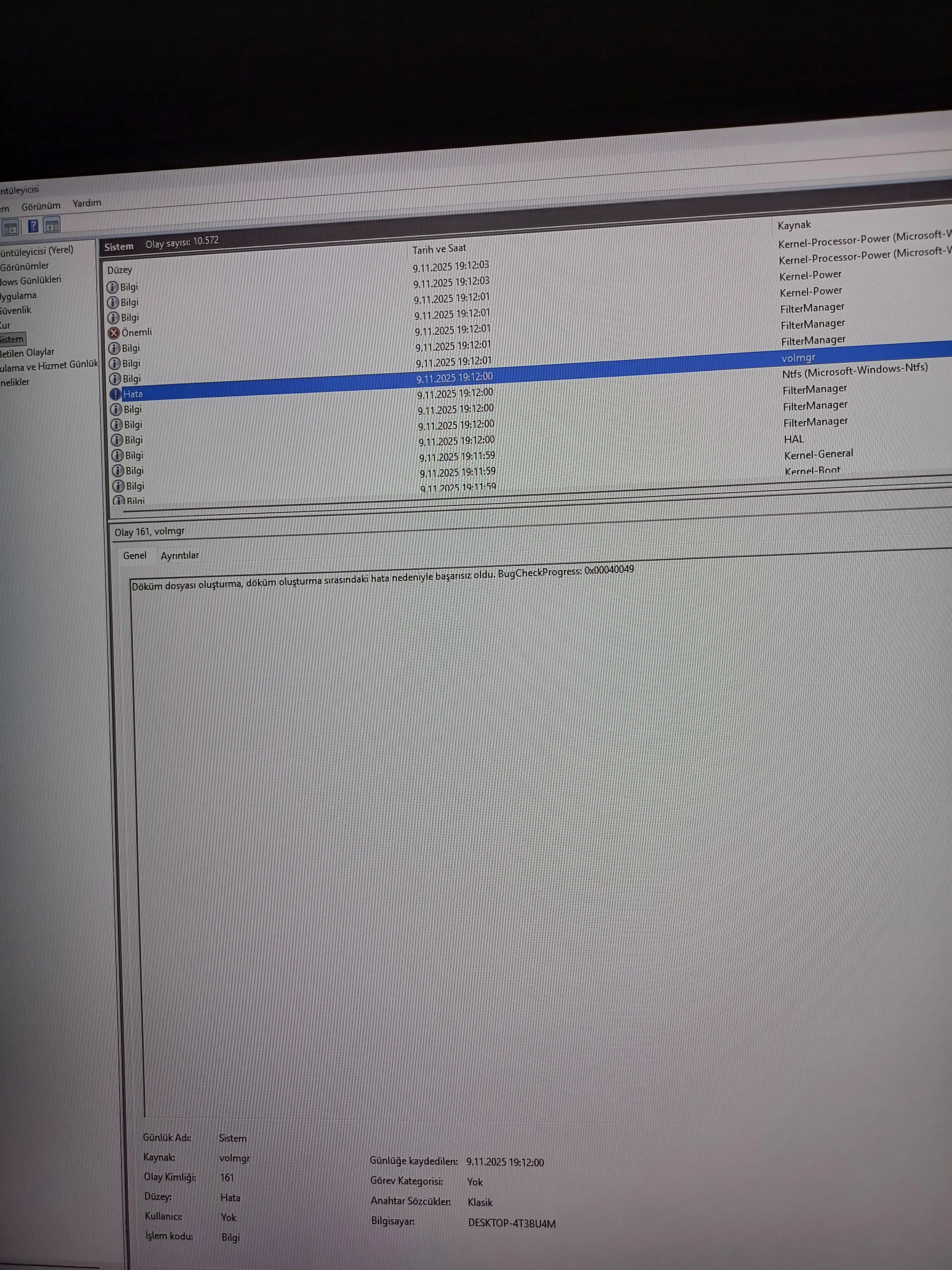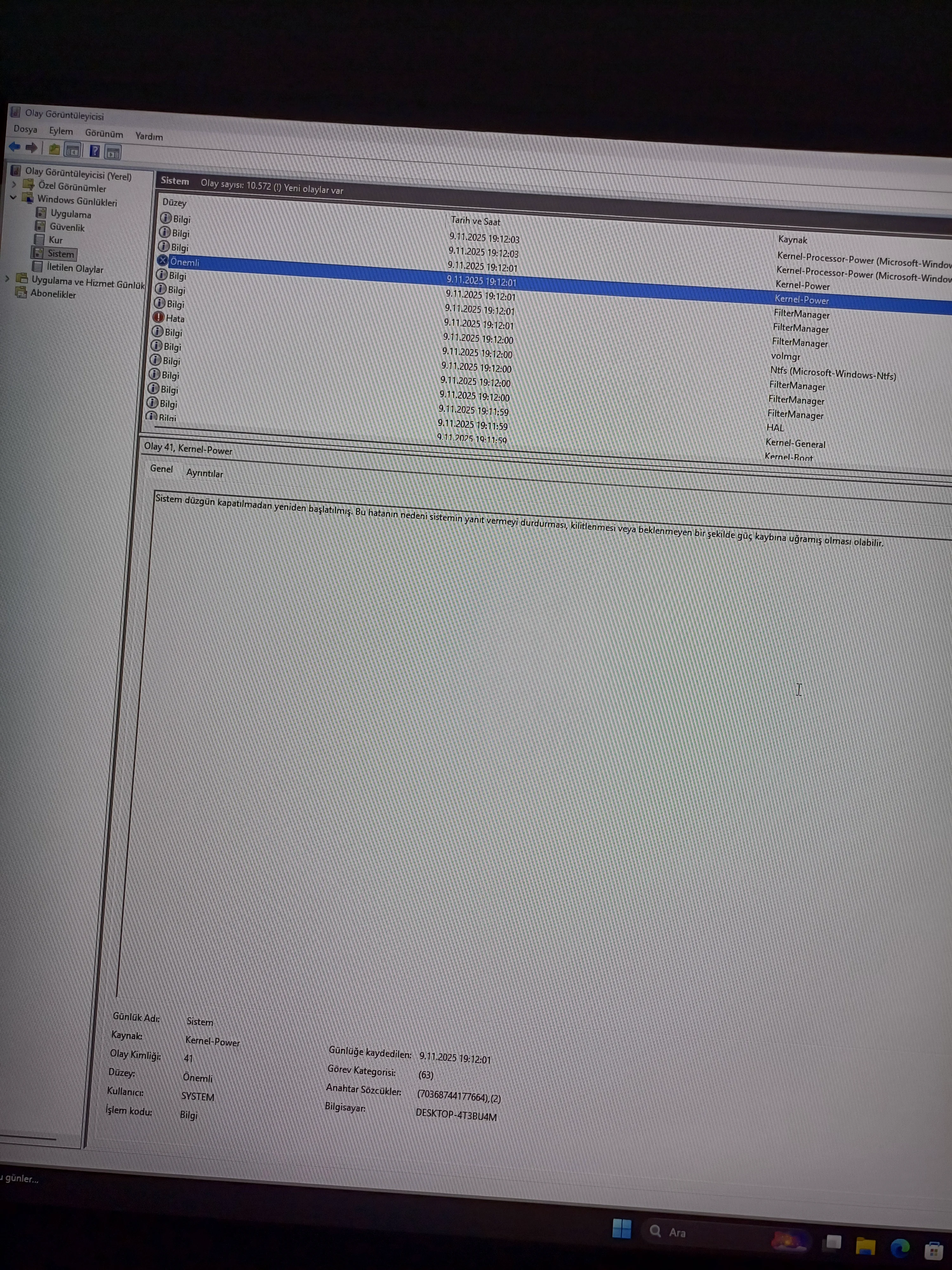 Sistem kendi kendine bi anda kapanıyor bu sorunu 2. kez yaşıyorum. Normal zamandada kapatınca kendi kendine kasa geri açılıyor ve fanlar dönüp rgb ışıklar yanmaya başlıyor ancak görüntü vermiyor. Uyku moduna alınca geri açılıyor. Aşağıya olay görüntüleyiciden aldığım hataları bıraktım.