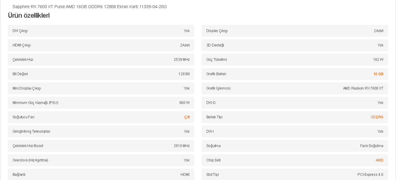 Ekran Kartı: Sapphire RX 7600 XT Pulse 11339-04-20G 128 Bit GDDR6 16 GB Ekran Kartı ( 6 ay önce aldım. )