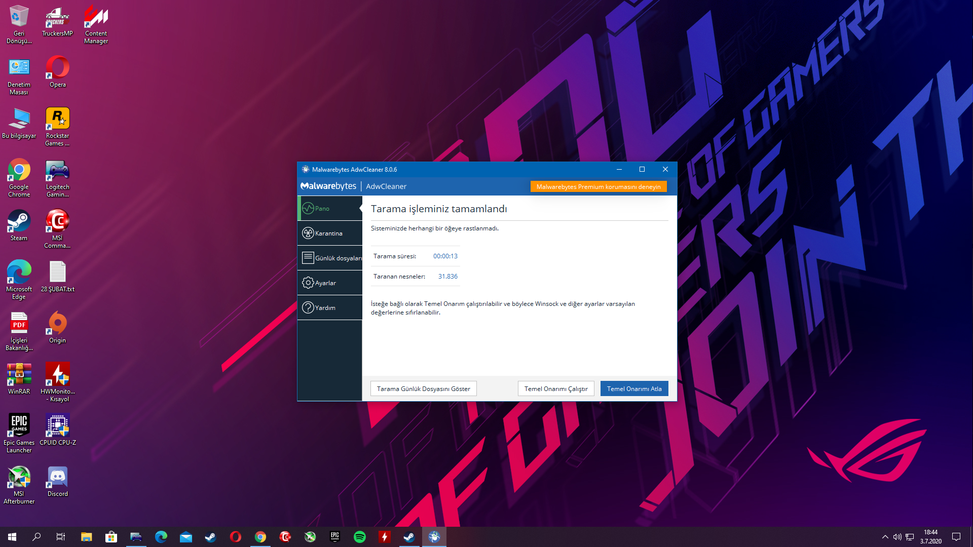 Hocam Kaspersky,malwarebyts ve adwcleaner ile tarama yaptım.Bunlar haricinde;windows defender ile de hızlı tarama yaptım.Sonuçlar temiz.Bir sorun gözükmüyor.Anlayamazsın, bazı virüsler kendini gizli tutup bilgilerinizi çalabilir. Anlamanın en iyi yolu bilgisayardaki kaynaklarda kullanım değişikliği var mı onu kontrol etmek (eğer yaratma yapmak istemiyorsanız). Kaspersky, adwcleaner ve malwarebytes ile tarama yapın.