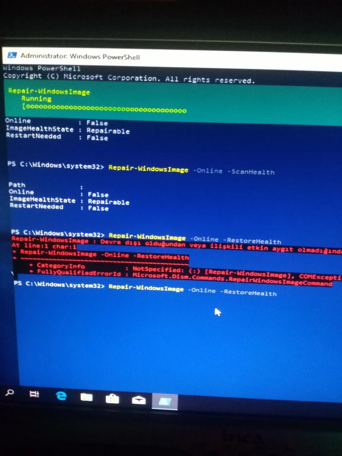 arkadaşlar cmd ile yapıyorum 98de kalıyor powershell ile yapıyorum böyle hata veriyor sanırım bozuk dosyalar var windowsu uptade edince yada ekran kartı driveri falan yükleyince bilgisayar siyah ekran olacak hiçbirşey yapmıyorum o yüzden başka çaresi varmıdırArkadaşlar hatayı alalı 1 hafta oldu ve ben bulamadım bundan önceki konuyla kimse ilgilenmedi bir kaç kişi dışında lütfen daha önce karşılaşanlar yardım etsin bıkmış durumdayım.