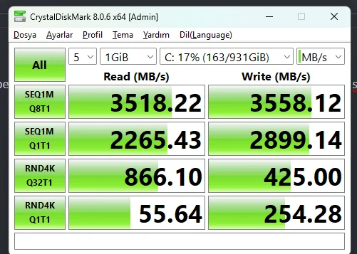 anakartınız pcie 3.0 olduğu içinKioaxia Exceria Pro 1 TB aldım 7.300/6.400 MB/s okuma yazma hızı var ama ben max 3500/2200 falan alıyorum ana kartım gen4 destekliyor o sloata taktım zaten. Asus h610m d-d4
