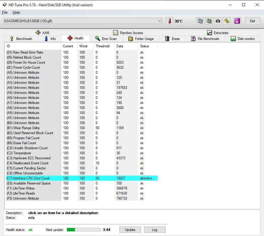 Herkese MerhabaBilgisayarım yaklaşık 2 haftadır durup dururken kasmaya ve ardından donup mavi ekran hatası vermeye basladı kapatıp açıyorum ozaman düzeliyor bzaen saatlerce hiçbirşey olmuyor ama bugün ard arda donup mavi ekran vermeye basladı bende ssd saglık testi yaptım ve SSD interface CRC error Acount hatası veriyor karsısında da 18027 rakamı var hd tune ile ölçüm yaptım error scan testinde komple yeşil kutucuklar hiçbir hata olmadı sonuçları resim olarak ekliyorum yardımcı olursanız çok seviniri, şimdiden teşekkürler