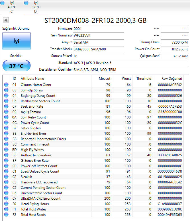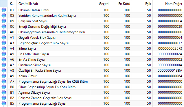 SMART verilerinde pek bir sorun gözükmüyor. Yedek bloklar biraz azalmış sadece. Bozuk blok falan bulunmuyor. Endişe edecek bir durum yok.