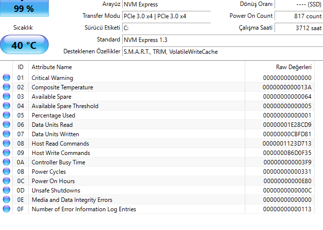 Bende SSDde o hata soranlarında değerler yok, harddiskte var... Normal midir?Komple uygulamanın ekran görüntüsünü at. Alttaki SMART verileri önemli olan.