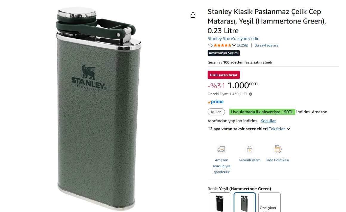 Stanley Klasik Paslanmaz Çelik Cep Matarası, Yeşil (Hammertone Green), 0.23 Litre