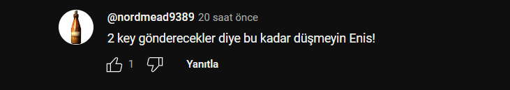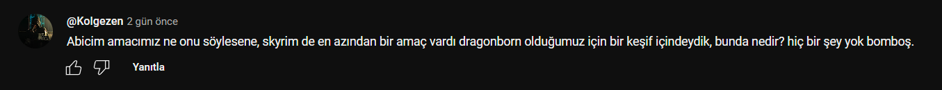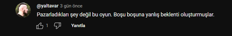 Herkes neyin ne olduğunu biliyor ki bu da beni sevindiriyor gelelim Enis o videoyu çektikten sonra gelen yorumlar küfürlü olanları almadım bile çoluk çocuk kandırırlar ancak 33 tane yorumu derledim Enisin videosuna gelen tepkiler.Meyve veren ağaç taşlanır hocam. Özellikle yöneticiler tarafından. Şuan erken basın sürümlerinin videolarını görüyoruz Youtube'de. Herkes övüyor da övüyor. Adam "evet NPC'ler çok kötü yaşayan npc yok ama benim için önemli değil oyun güzel diyor (Enis Kirazoğlu)" O zaman açık dünya RPG oynamanın ne anlamı var? Neyse ben tarafsız basının okuyucusuyum. Şimdi o kadar bilgiyi buraya yayarsam Fanboy olurum. Hatta banlanırım birde...