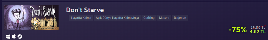 Dont Starve: Kendisi adından da anlayacağınız gibi, açlıktan ölmemeye çalıştığınız bir hayatta kalma oyunudur. Kendim çok bayılmıyorum bu tarza ama sevenler alabilir.