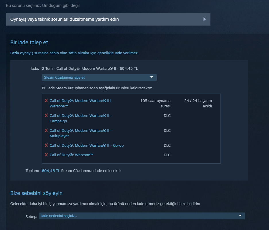 Ben oyunu aldım ve daha oynamadan iade etmek istiyorum ama ücretsiz olan Warzone'yi oynadığım için iade kabul edilmiyor ama ben gelen ek campaing DLC'sini falan hiç oynamadım. Nasıl iade edebilirim ya da nasıl Steam destekle bunu konuşabilirim?