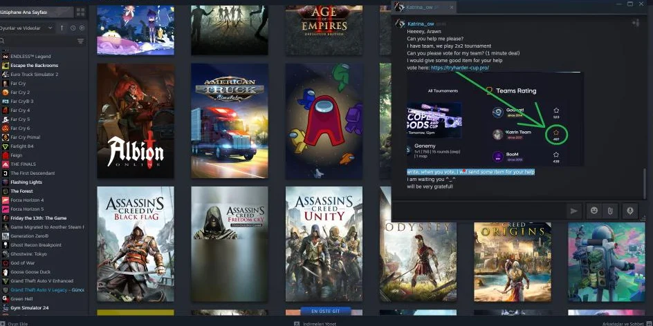 genelde bu bu yöntemi kullanıyorlar oy verir misin ödül kazanacaksın turnuva katılmak ister misin diye link atıyor böyle gelirse direk arkadaşlık çıkar bunları
