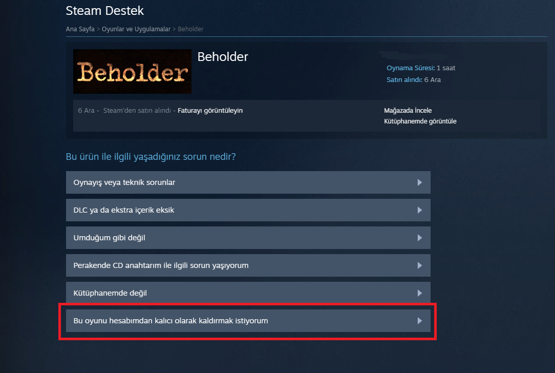 3. "Bu oyunu hesabımdan kalıcı olarak kaldırmak istiyorum" seçeneğine tıklayın.