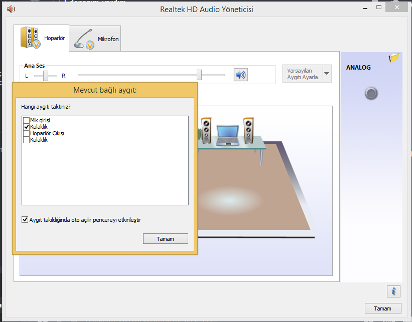 Not: W8.1 kullanıyorum ve realtek ses yazılımı yüklü. Jack girişini taktığım zaman realtekin seçim ekranı gelliyor ve mecbur kulaklığı seçiyorum.