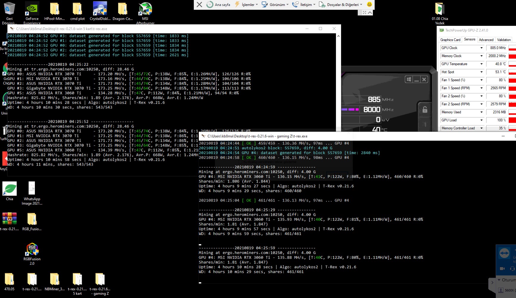 NBMiner/Phoenixminer gibi ortak Miner ' ları kullanabilirsin. Ethash için Phoenix. Kawpow/ethash/chuckwa için NBMiner.