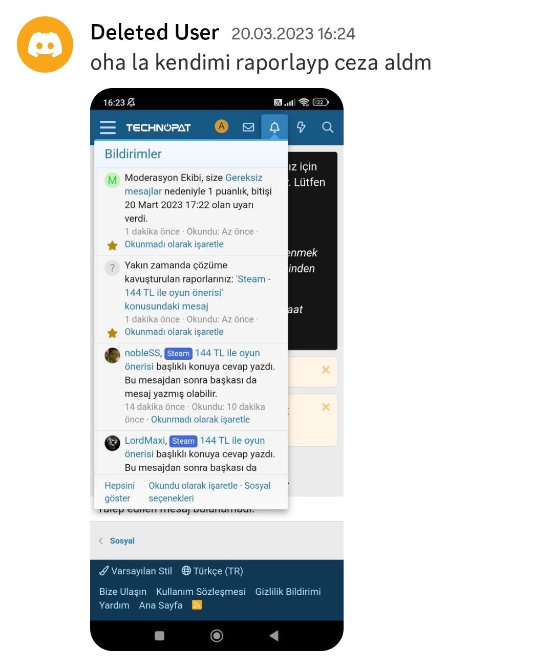 Technopatta hiç yazım yanlışı yemedim fakat hep gereksiz mesajlardan yedim. Bu olayını sevmiyorum fakat yine de aktif ve güzel forum.forum ortamına girişim technopatladır. 5 yıl sonunda hesabımı kapatmak zorunda kaldım. eski üyelerin kalitesi yok. technopatın da yaş kitlesi baya düştü. bilginin yaşla alakası yok ama 2021 de bilgisayar toplama kategorisinde çok yardım aldığım bir üye vardı, adam 14 yaşındaymış ama o kadar kibar o kadar bilgili biriydi. pandemiden sonra öyle üyeler forumu bıraktı ve yerine gırgır şamata peşinde olan tipler geldi. tabii hesabımı üye kalitesi düştü diye kapatmadım. 5-6 yıllık hesaptı ve uyarılar baya birikmişti. yazım yanlışına falan 1 hafta ban atmaya başladılar. kaç yıllık üyeyim dikkat etmeme rağmen arada yazım hatası yapıyorum, insanlık hali yani. bi ara gereksiz mesaj, yazım yanlışı diye 2 uyarı aldım bir ay kadar uzaklaştırılmış oldum,bu agresif kurallara artık sabredesim yoktu ben de bıraktım.