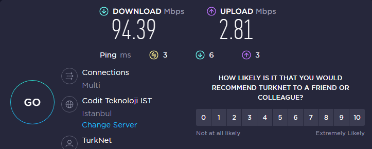 cat7 altın kaplama kablo ile bağlı bu arada. Bir de pc ye wifi adaptörü taktığımda yine 2.8mbps alıyorum