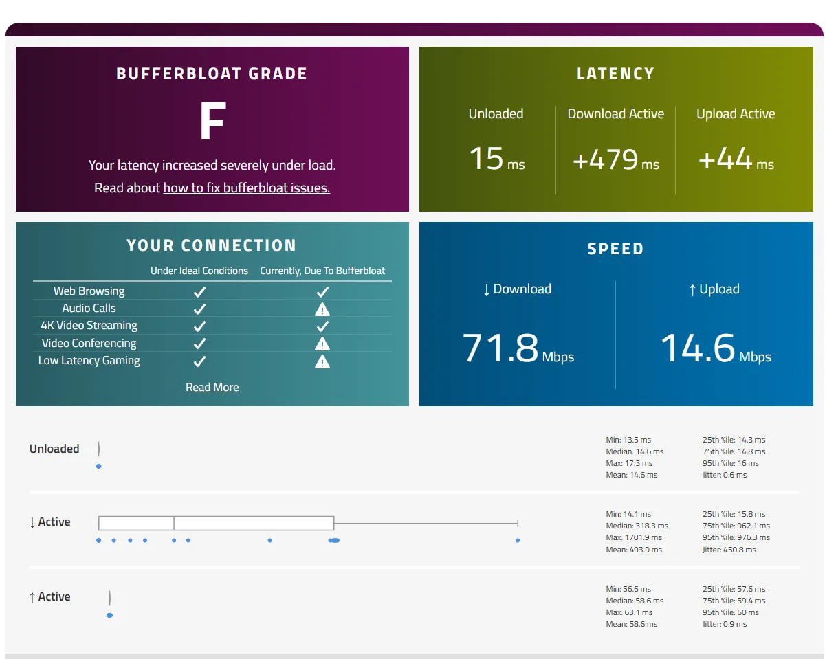 Tenda'nın V12 AC1200 model modemine sahibim ancak bufferbloat testlerinde F alıyorum. Bu sorunu düzeltemedim, yardımcı olabilir misiniz? İnternet sağlayıcım TürkNet.