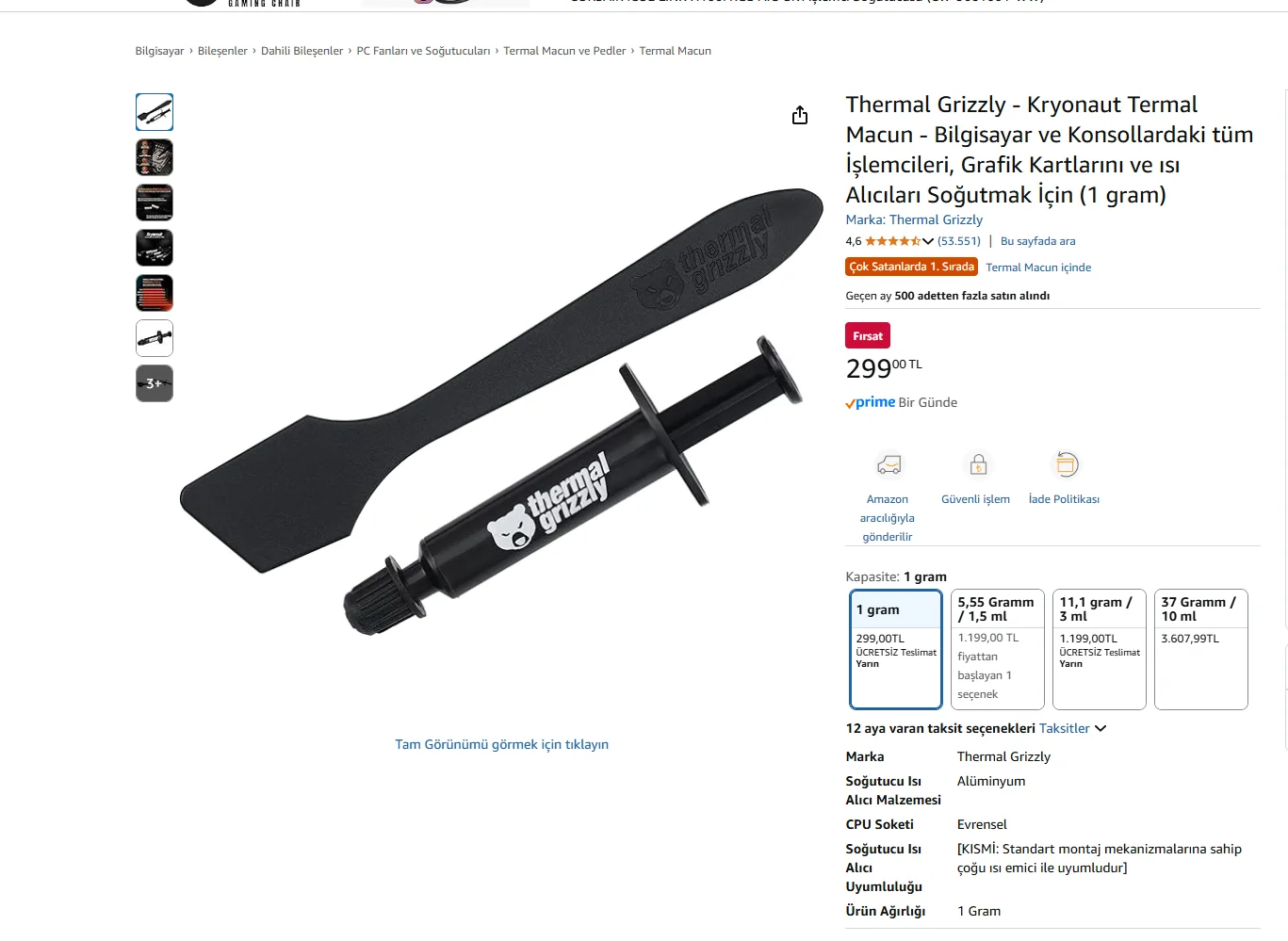 Thermal Grizzly - Kryonaut Termal Macun - Bilgisayar ve Konsollardaki tüm İşlemcileri, Grafik Kartlarını ve ısı Alıcıları Soğutmak İçin (1 gram) : Amazon.com.tr: Bilgisayar