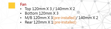 Anakart paneline önceden monte edilmiş 3 × 12025 ARGB PWM fanları ve arkaya önceden monte edilmiş 1 × 12025 ARGB PWM fanı ATX'e Kadar Anakart Desteği 220 mm ATX PSU desteği VGA kartı uzunluğu 410 mm Üst Düzey Vitrin ATX kasası ÇİFT odacıklı tasarım Üç üst USB (USB3.0 × 2; Type-C × 1)