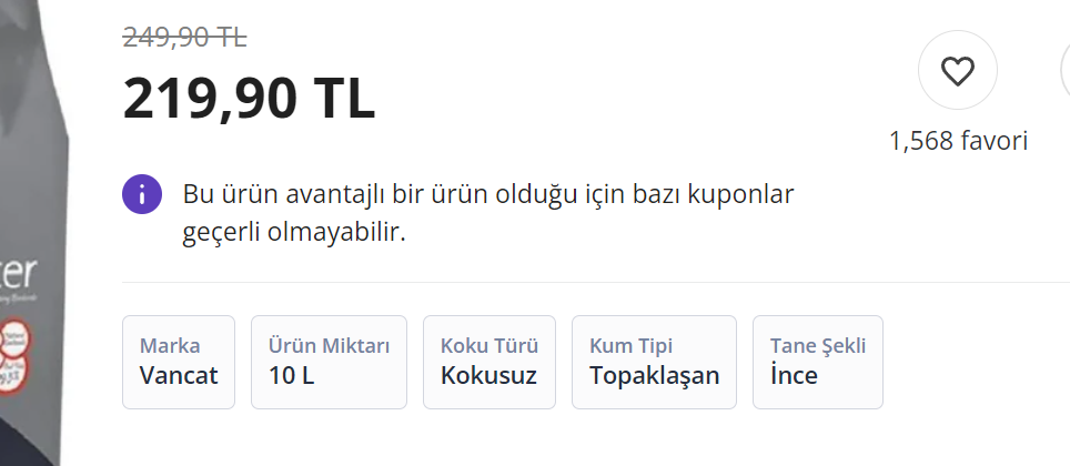 bana da kedi kumu lazım link atsana bakayım bendekuponu her yerde kullnadırtmıyor, 200 / 50 TL kupon kaptım kedi kumu alacaktım o kategoride çalışmıyormuş![]()