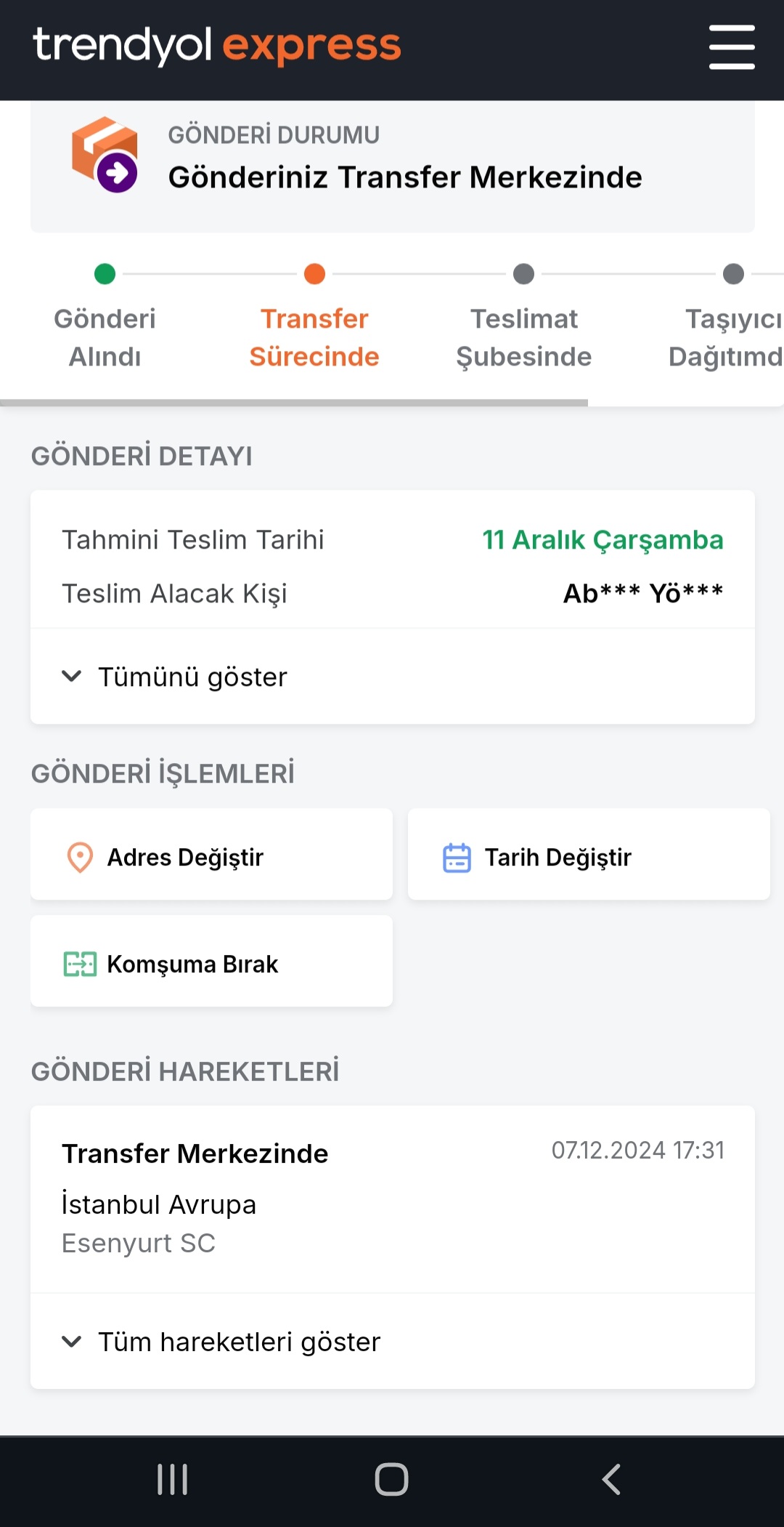 6 Aralıkta Trendyoldan bir sipariş verdim,7 aralıkta kargoya verildi diye bildirim geldi.O günden beridir,tam 4 gündür kargom Transfer Merkezinde olarak gözüküyor ve ürünün tahmini teslim günü de 11 Aralık.Yani bugün gelmesi gereken kargo hala Transfer Merkezinde.Bu işte bir gariplik olmalı.Bu sorunu nasıl çözebilirim? Trendyola mail atsam sorunum çözülür mü? Bugün müşteri hizmetlerinide aradım onlarda gecikme talebi oluşruracaklarını söylediler.Sizce böyle bir durumda ne yapılmalı?
