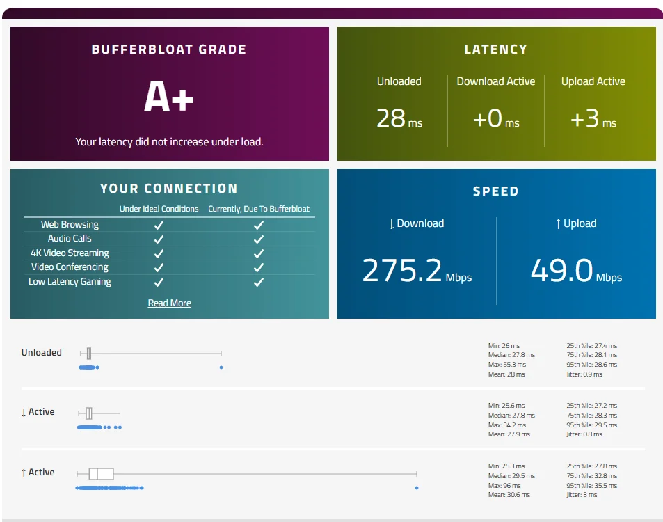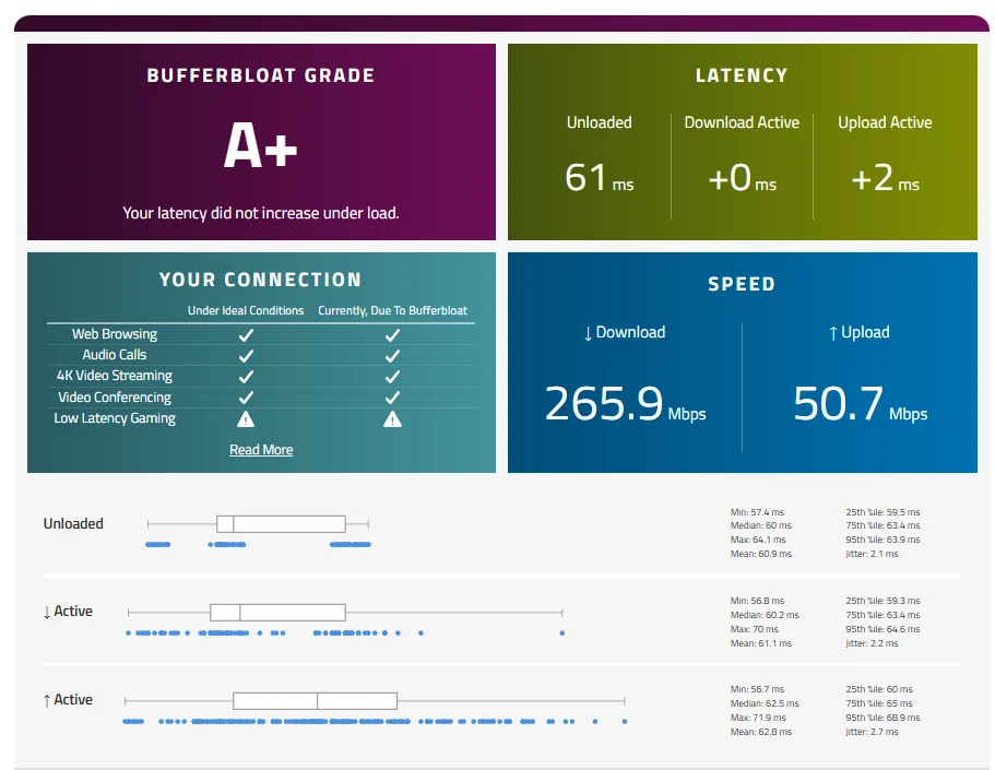 Arkadaşlar herkese merhaba. Afyonkarahisar'da yaşıyorum. Türk Telekom 1000 Mbit FTTH fiber internet kullanıyorum. Keenetic Hopper router ile kullanıyorum. ONT Huawei marka. Routerden QoS ayarlarım yapılı. Bufferbloat ölçme sitesinde yüksüz ms im 60 civarlarında çıkıyor. EA FC 26 da 58 60 civarı ms alıyorum. Oyun oynanabilecek durumda değil. Müşteri hizmetlerini arıyorum bir süre sonra 30'a düşüyor sitede ama oyunda hala yüksek. Sonra sitede geri 60'a yükseliyor. Bu normal mi? Bu sorunu nasıl çözeceğim bilenler yardımcı olsun. Test sonuçlarını görsel olarak bırakıyorum. ( QoS açılınca download hızı 300'e düşüyor)