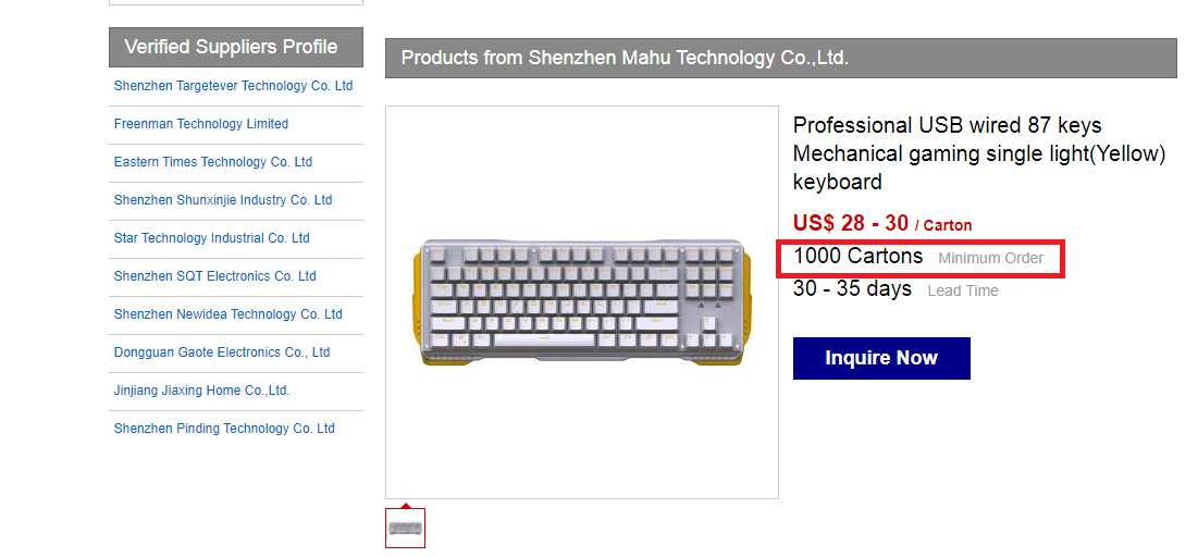 O sitede ürünler kısmında şu şekilde bir klavye gördüyoruz. Bu klavye "James Donkey 612" klavyenin aynısı. Ve işaretlediğim yerde "Minimum 1000 sipariş" yazıyor. Yani bu Çin`li firma bu tür ürünleri üretip toptan bir şekilde satıyor ve James Donkey etiket basıyor.