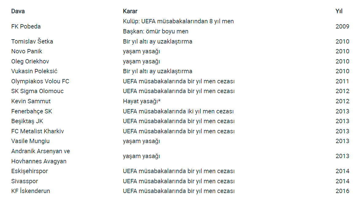 UEFA'nın resmi sitesinde bulunan son 13 yılda şike yapan takımların listesi.