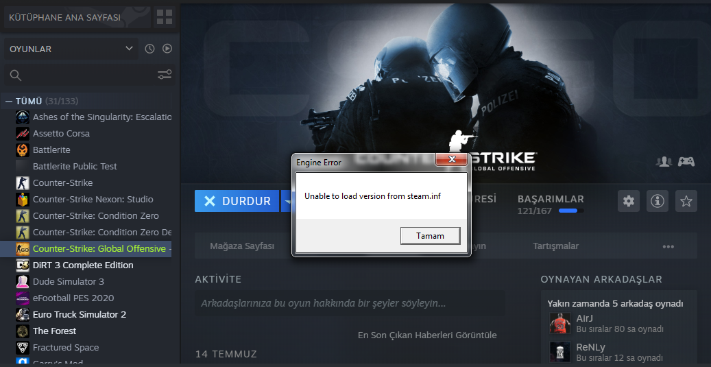 Arkadaşlar cs yi açtığımda bu hatayı alıyorum oyunun dosyalarının bütünlüğünü doğruladım oyunu silip tekrar yükledim steam her şey güncel fakat bir türlü düzelmiyor yardımcı olabilecek var mı ?