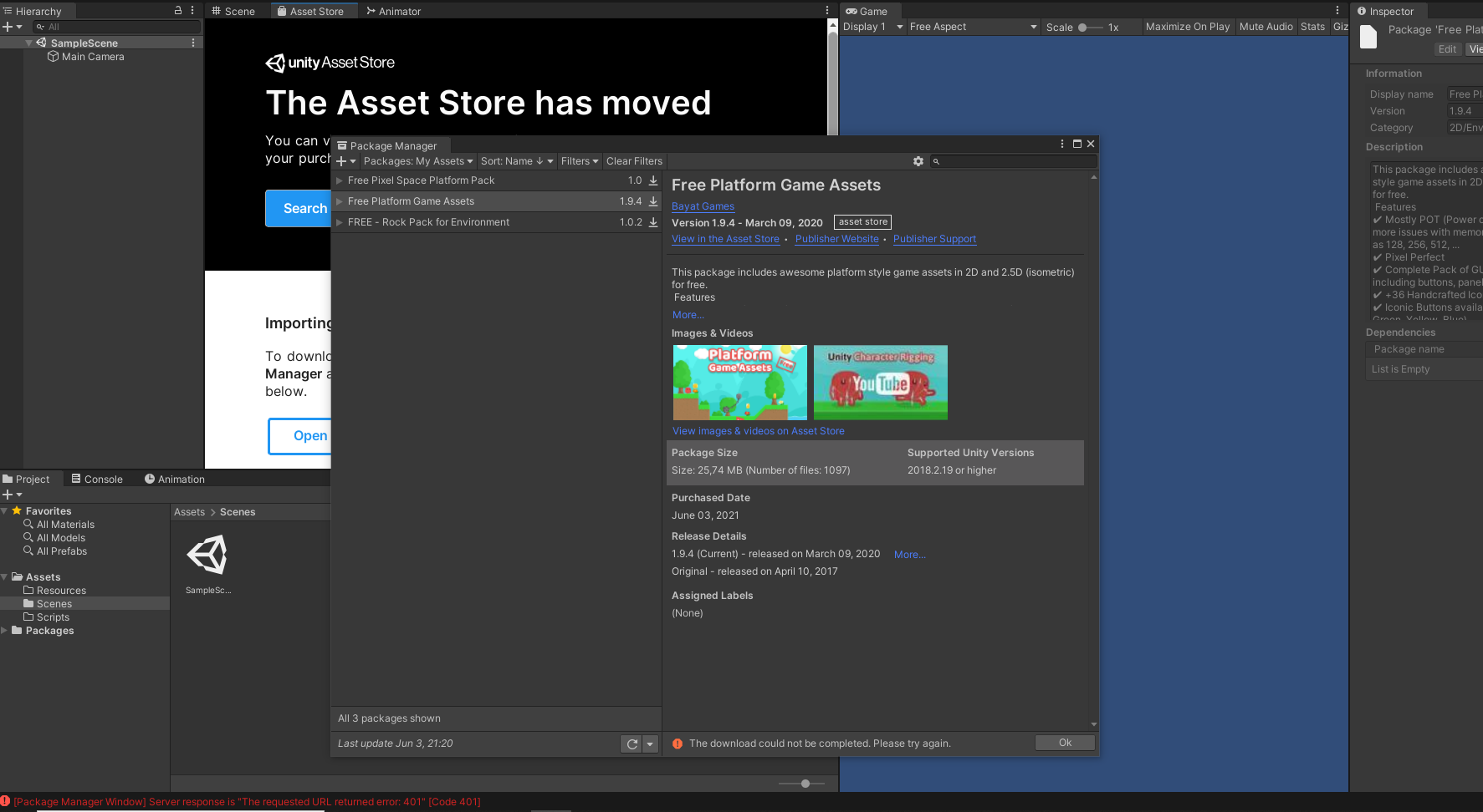 Selamlar unityde asset storeda asset indiremiyorum. Package managerda download kısmına tıkladığımda "the download could not be completed. Please try again later" yazıyor. hemen aşağısında ise Error code 401 yazıyor. Yardımcılı olabilecek varsa çok sevinirim. ( hesabıma giriş yaptım)