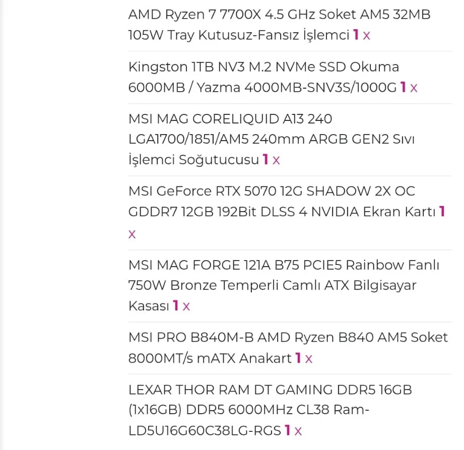 9700x + 9070xt + dramli ssd + 32gb 6000mhz cl30 ram + B850 li sistem 60-65k civarına toplanabilir kasım indirimlerinde