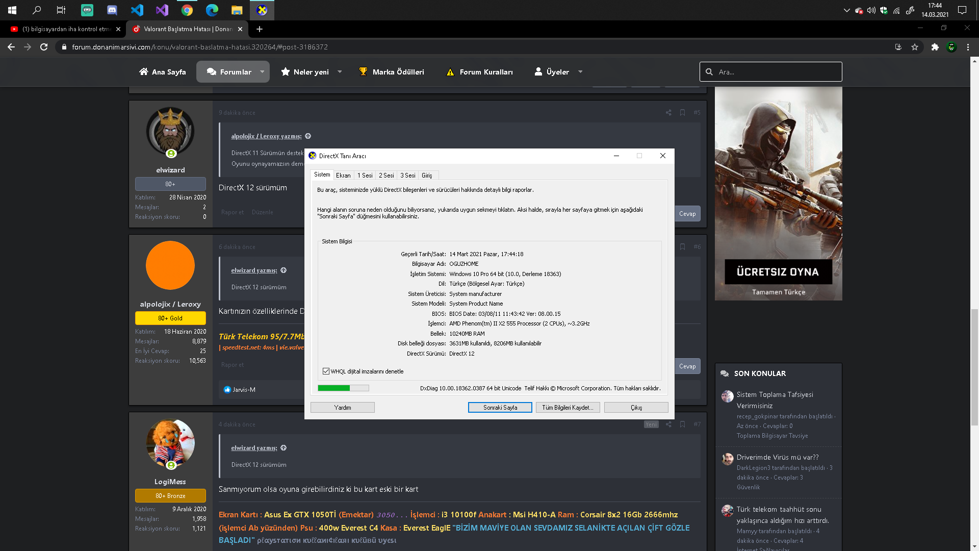Valorantta oyunu başlata tıkladığımda dx11 feature level 10.0 is required to run the engine hatasını veriyor internetteki tüm hata çözümlerini izledim Ekran kartım:Geforce GTS 250