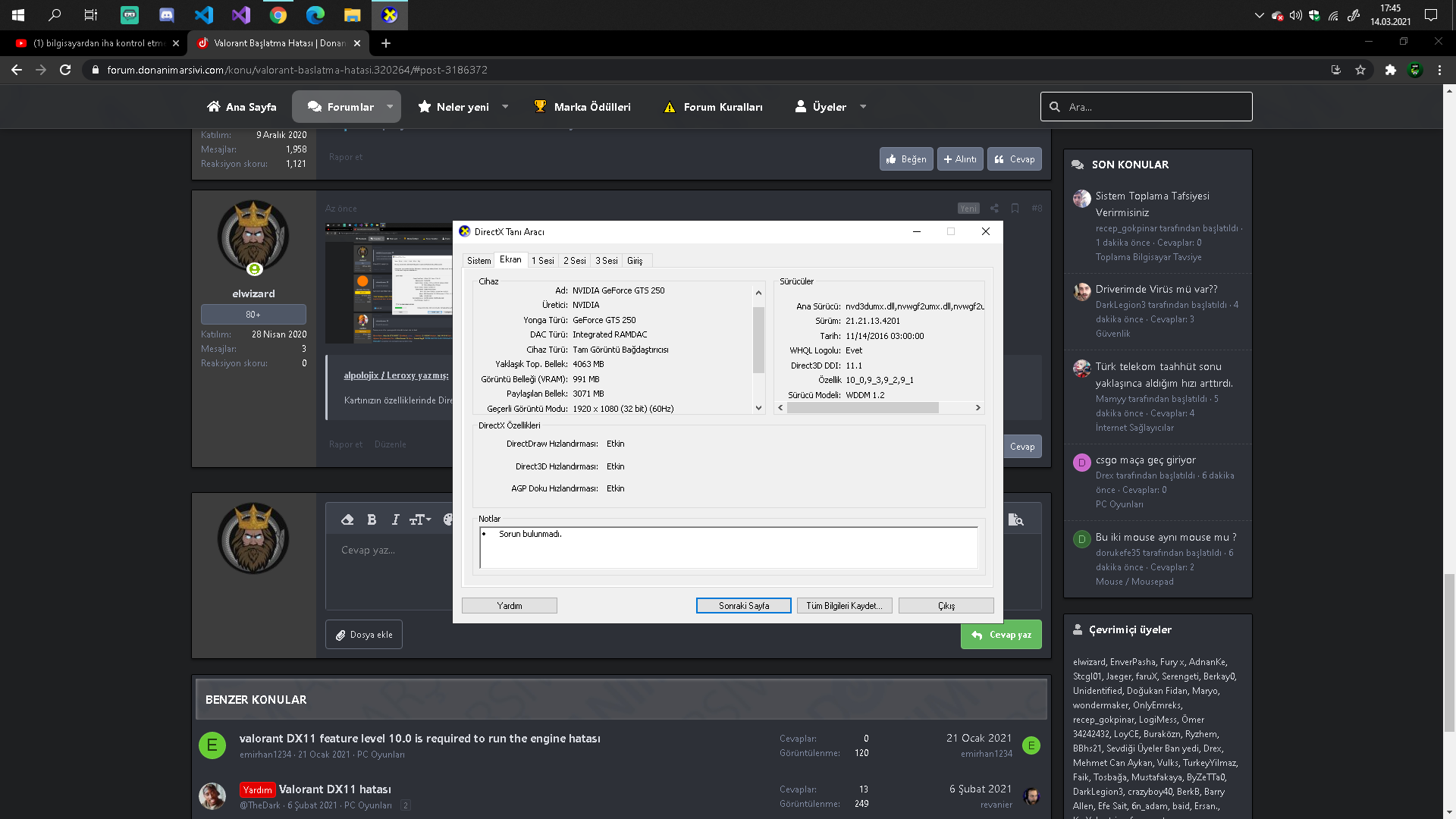 elwizard 80+ Katılım 28 Nisan 2020 Mesajlar 5 Reaksiyon skoru 2 14 Mart 2021 #1 Valorantta oyunu başlata tıkladığımda dx11 feature level 10.0 is required to run the engine hatasını veriyor internetteki tüm hata çözümlerini izledim Ekran kartım:Geforce GTS 250