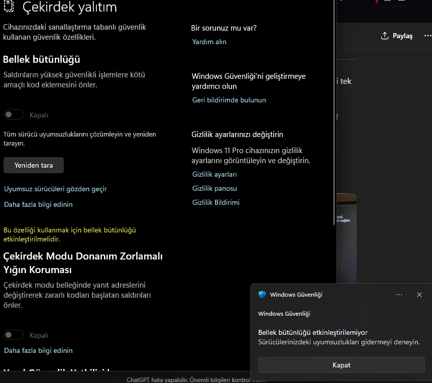 HVCI sorunu varmış baktım biraz çekirdekyalıtımını açmamızı iistiiyor ama açamıyyyorum sürüclerde hata var diyor çözümü nedir