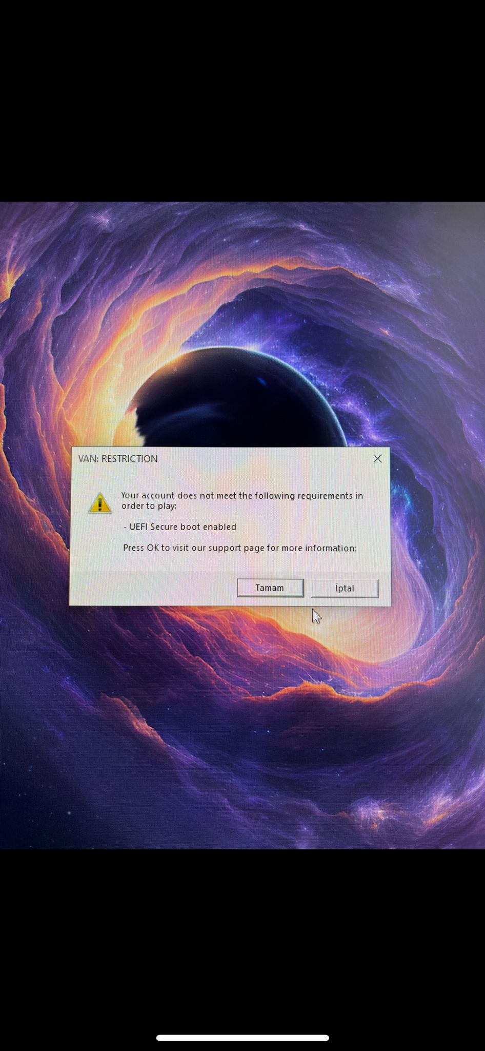 anakartının markasını youtube yazıp valorant bios setting yaz ya da marka secure boot da yazsan çıkar direktarkadaşlar merhaba fotoğrafta da görmüş olduğunuz üzere maçtayken bi anda bu hatayı veriyor ve pat diye oyun kapanıyor sorun nedir? nasıl çözebilirim?Alıntıyı görüntüle