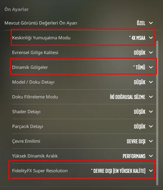 Mevcut görüntü değerlerini en düşüğe alın. Sonra dinamik gölgeleri Tümü yapın. Bu ayar karakter gölgelerini sağlıyor, yani oyunda avantaj sağlayan tek ayar. Bir de FSR devredışı yapın. Kenar yumuşatma tamamen size kalmış. Ben 1080P de 1280x960 da oynasam en kötü 4x MSAA açıyorum. Hatta 8X MSAA yapıyorum çoğu zaman.