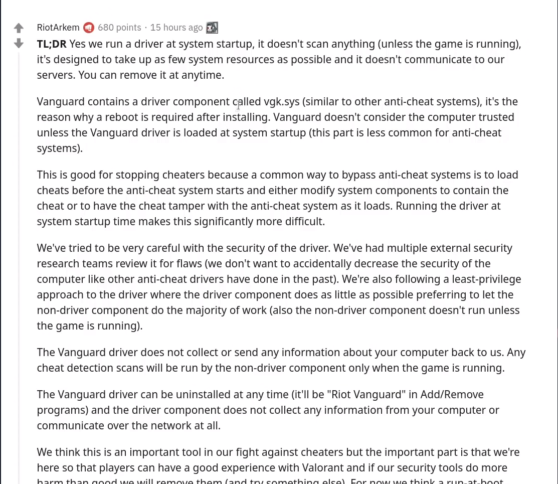Vanguard düzgün çalışmadığında bilgisayarınızı baştan başlatmanızı gerektiren şey de bu. Bütün yetkiyi alabilmesi için sistemin baştan başlaması gerekiyor. Yani bir rootkit. Amacı hileyi engellemek olabilir. Fakat bütün yetkilere sahip olan bu hile koruma programının Riot Games yani Tencent Games'e ait. Tencent Games'de Çine ait bir firma. Çin Vanguard'ı kötü amaçla kullanmayabilir. Ama bilgisayarınızı hacklemeye çalışan kişilerin bu programı kullanıp bütün yetkilere sahip olabileceği anlamına geliyor bu. Ayrıca bu kadar yetkiye rağmen hileleri engelleyemediler