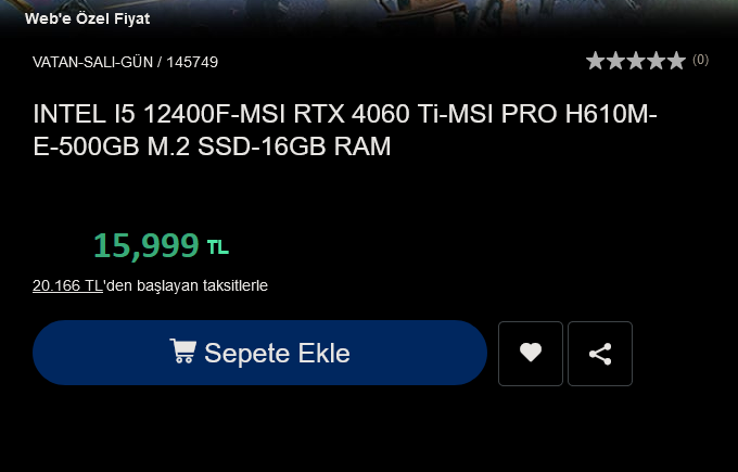 Bu değildir umarım ddr4 ve i5 libirazdan fiyatı güncellenecek sanırım en son eklenen sistem bu ürün açıklamasında salı diye ekte varINTEL I5 12400F-MSI RTX 4060 Ti-MSI PRO H610M-E-500GB M.2 SSD-16GB RAM fiyatı, teknik özellikleri, modelleri, en ucuz fiyatlarla Vatan Bilgisayar'da