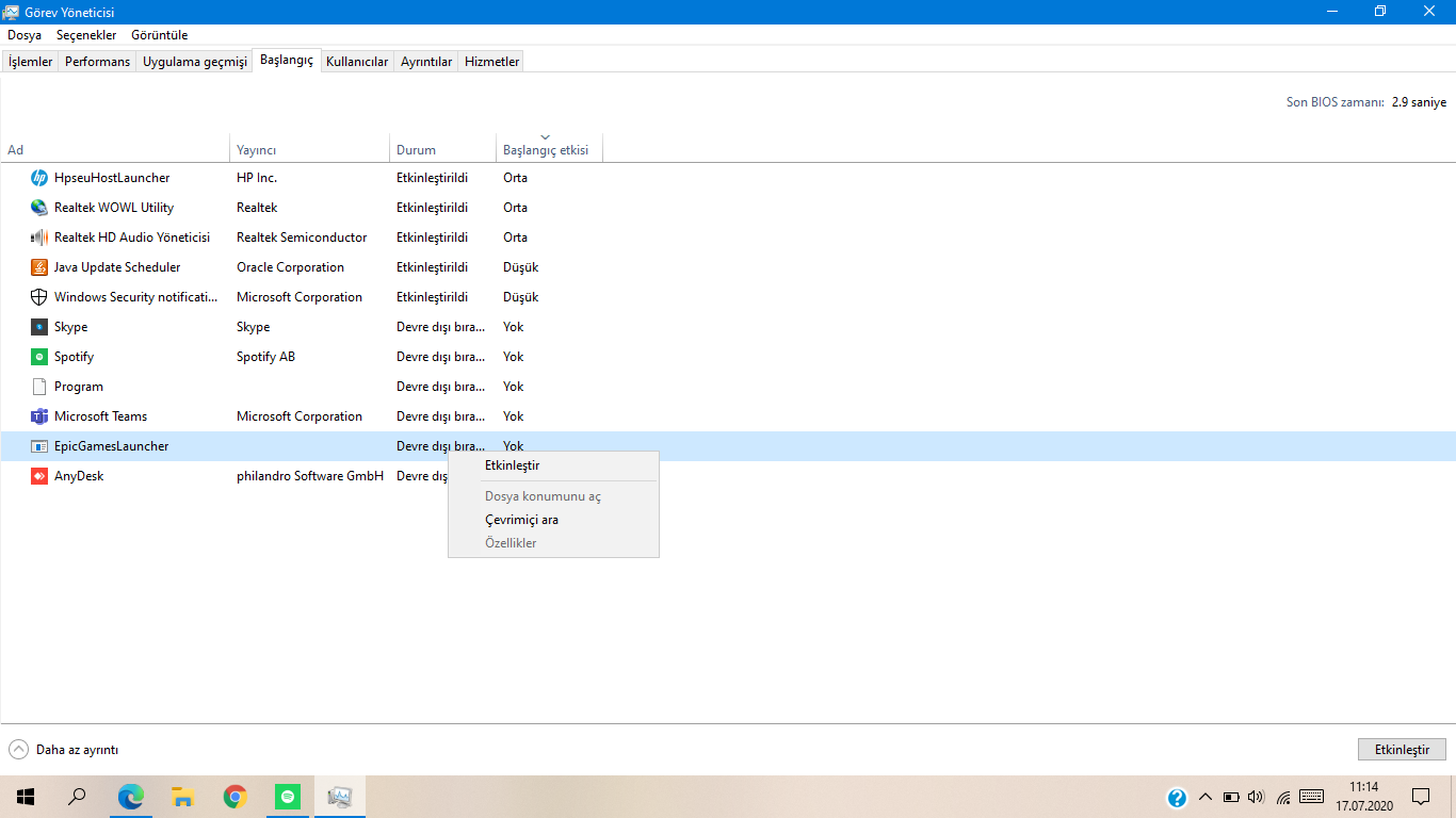 Selamlar Windows 10 işletim sistemimde Görev yöneticisine girdiğimde başlangıç sekmesine gelince bilgisayarımda epic games olmamasına rağrem orada gözüküyor sağ tık yaptığımda etkinleştir ve çevrim içi ara seçenekleri açık ,özellikler ve dosya konumu kapalı ,